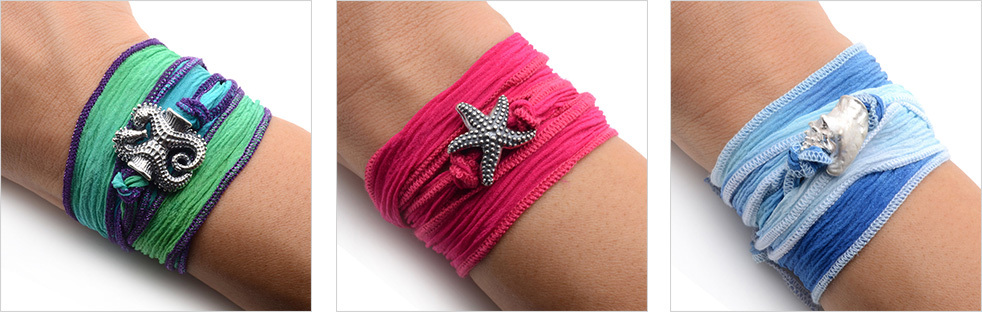 Our Hawaiian silk wraps can hold 1, 2 or 3 charms. You wind them around your wrist and tie with a small bow. We suggest to make a knot on either side of the charms so they don't slide around. The wraps are 100% silk, have finished edges and are quite durable. They measure approximately 33" in length.