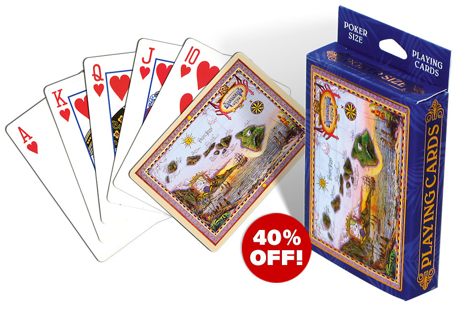 $6.98Set of Poker CardsArtwork by Steve Strickland These playing cards are packaged in Satin Laminated Boxes with Metallic Gold Foil Graphics. Poker Size Cards 3.5 x 2.5 inches Featuring Hawaiian Vintage Art High Quality Lamination Hawaiian Designed Joker...$6.98
